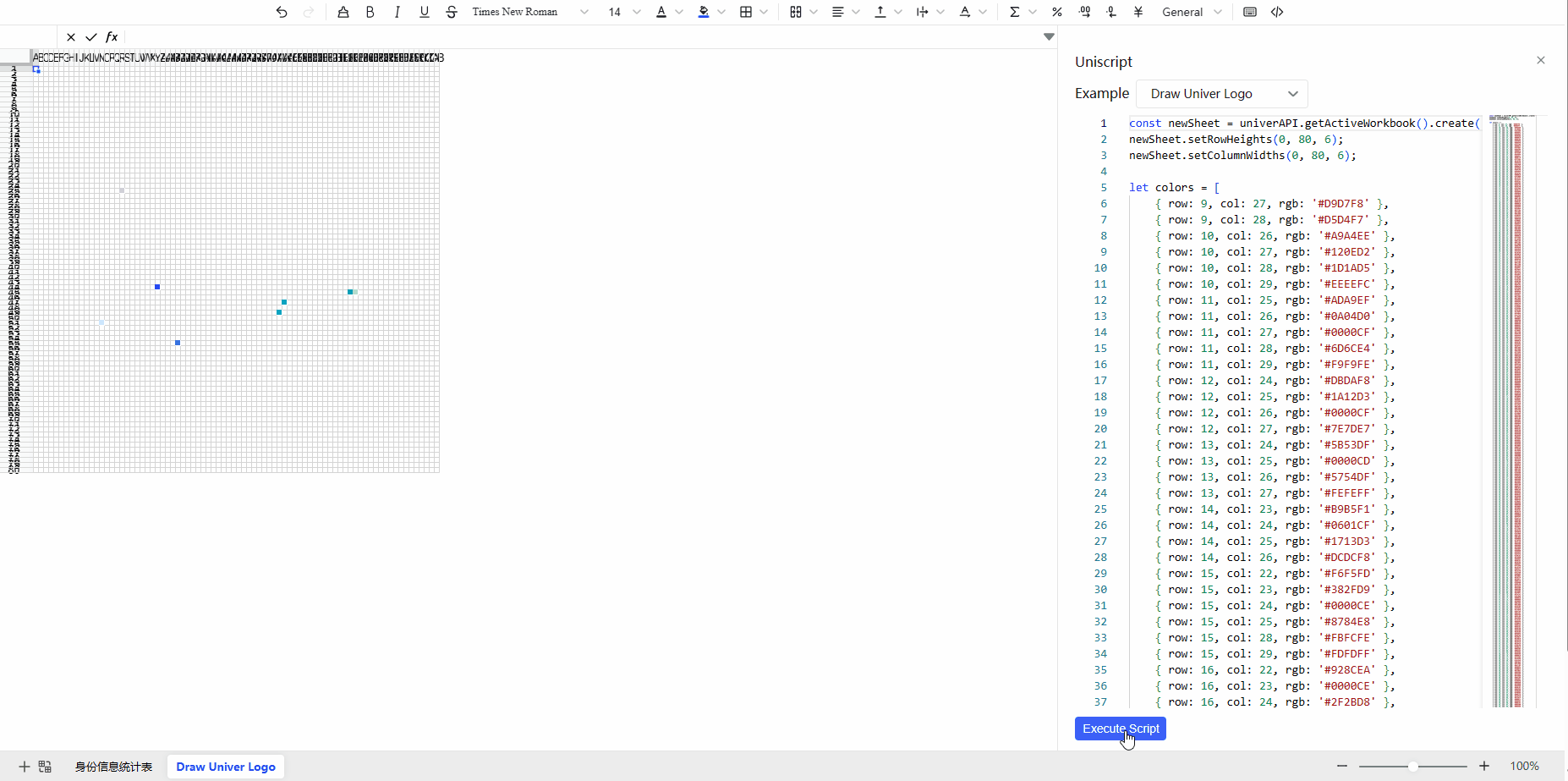 Initially, we attempted this through the Uniscript plugin, which allowed users to write custom scripts in the sidebar. For example, users could draw a pixel-art Univer logo using Uniscript.